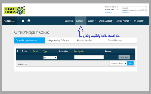 بعد إيداع المبلغ سيمنحك الموقع عنوانك الأمريكي الذي ستستعمله عند شراء أي منتوج وستجد جميع الطلبات في قسم packages كما في الصورة :