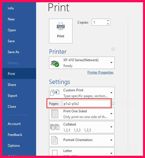 أولاً ، لنفترض أنك تريد طباعة الصفحات 1-3 من القسم 2. فأنت تكتب هكذا p1s2-p3s2 كما في الصورة أدناه