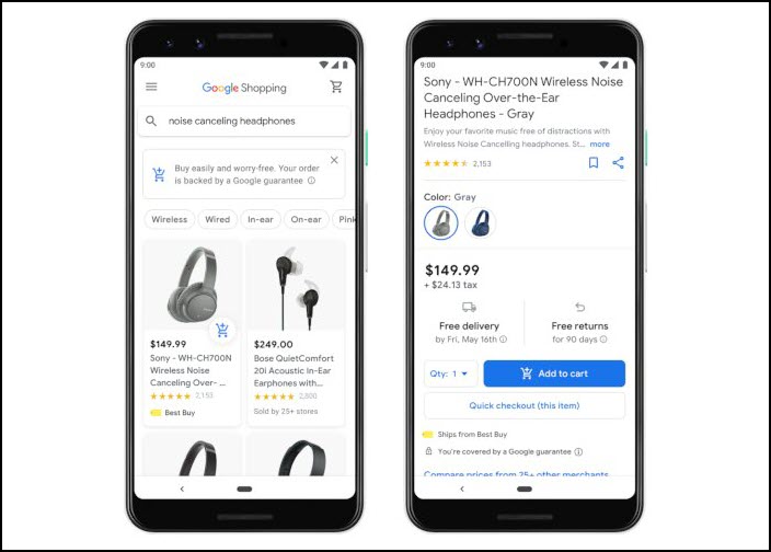 هل تبحث عن سماعات جديدة ؟ هل تريد تجديد هاتفك الذكي؟ يمكنك شراء أي منتج دون مغادرة غوغل وبضمان من الشركة الأمريكية. ستكون غوغل مسؤولة عن الوساطة إذا لم تستلم منتجك ، أو إذا اكتشفت أنهم أرسلوا شيئًا لم تطلبه.